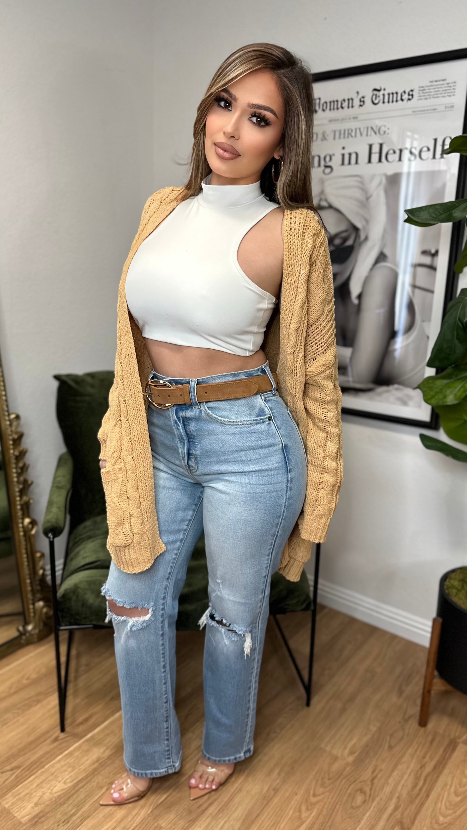 A thick, cozy cable-knit cardigan designed for effortless layering. Features side pockets and a relaxed fit perfect for staying warm while looking chic and put together.