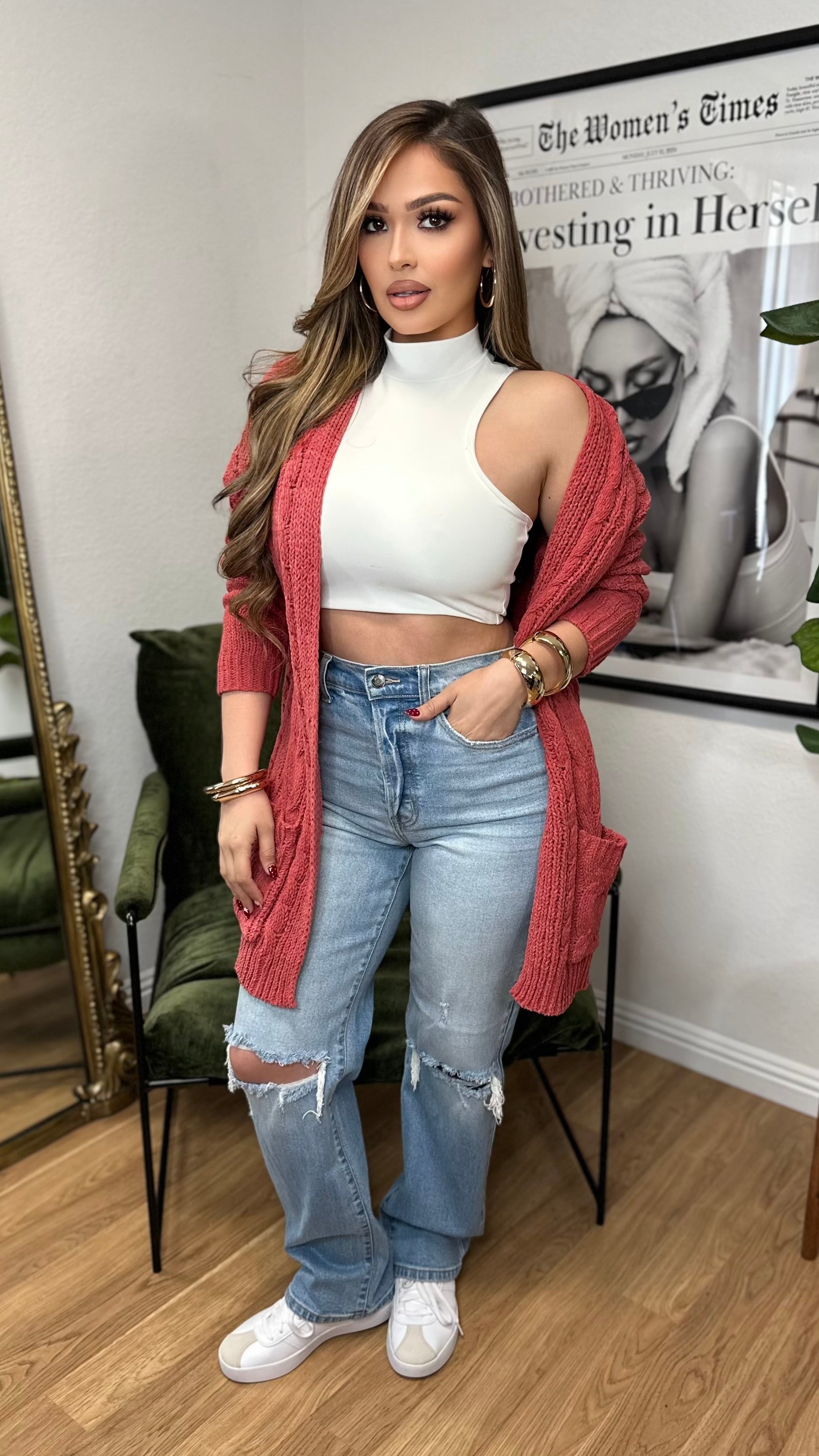 A thick, cozy cable-knit cardigan designed for effortless layering. Features side pockets and a relaxed fit perfect for staying warm while looking chic and put together.