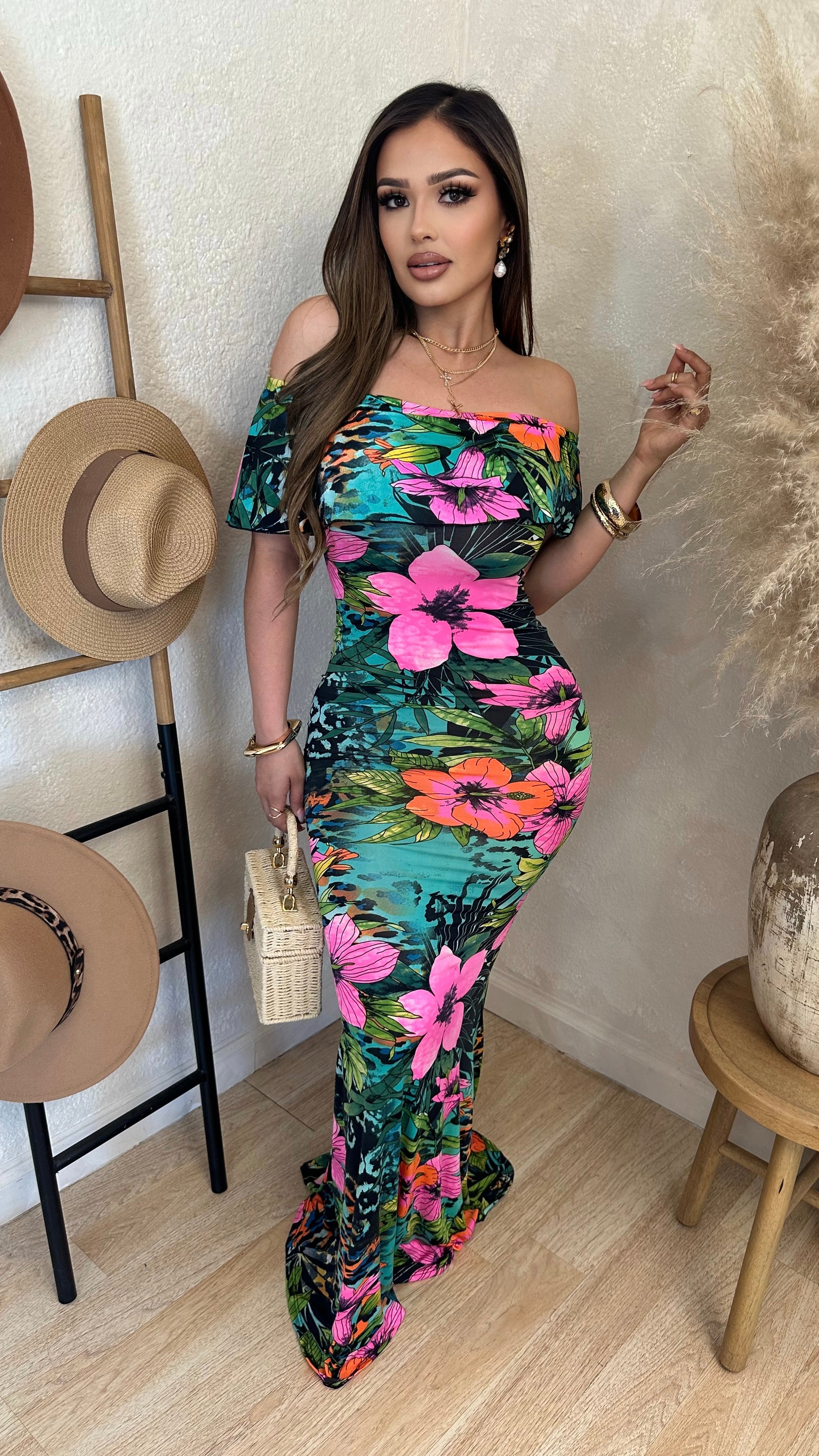 Step into paradise with this vibrant floral maxi dress, designed to hug your curves while keeping you effortlessly chic. The off-shoulder neckline adds a sultry touch, balanced by a floor-length hem that glides with every step. With bold tropical blooms in vivid hues, this dress is perfect for vacations, summer parties, or sunset dinners by the beach.