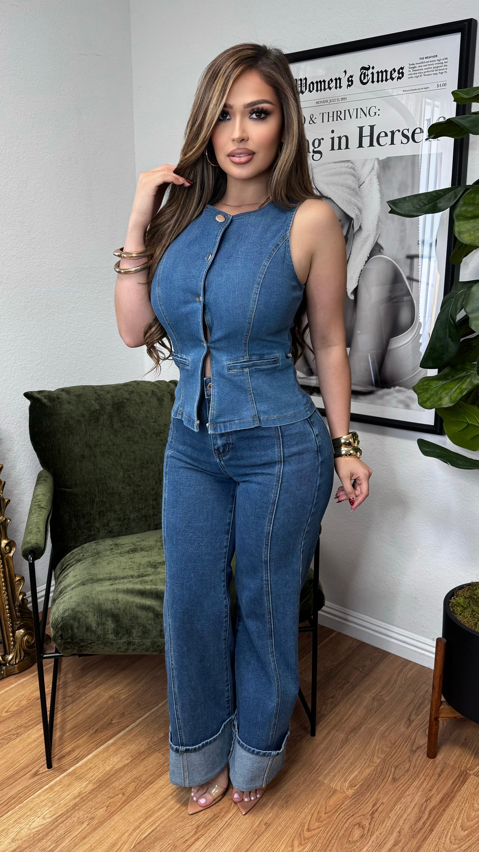 Chic and flattering with a tailored edge. This sleeveless denim top features a structured fit with a button-front design and subtle peplum flare that cinches the waist for a sculpted silhouette. Perfect for dressing up denim or pairing with trousers for an elevated everyday look.