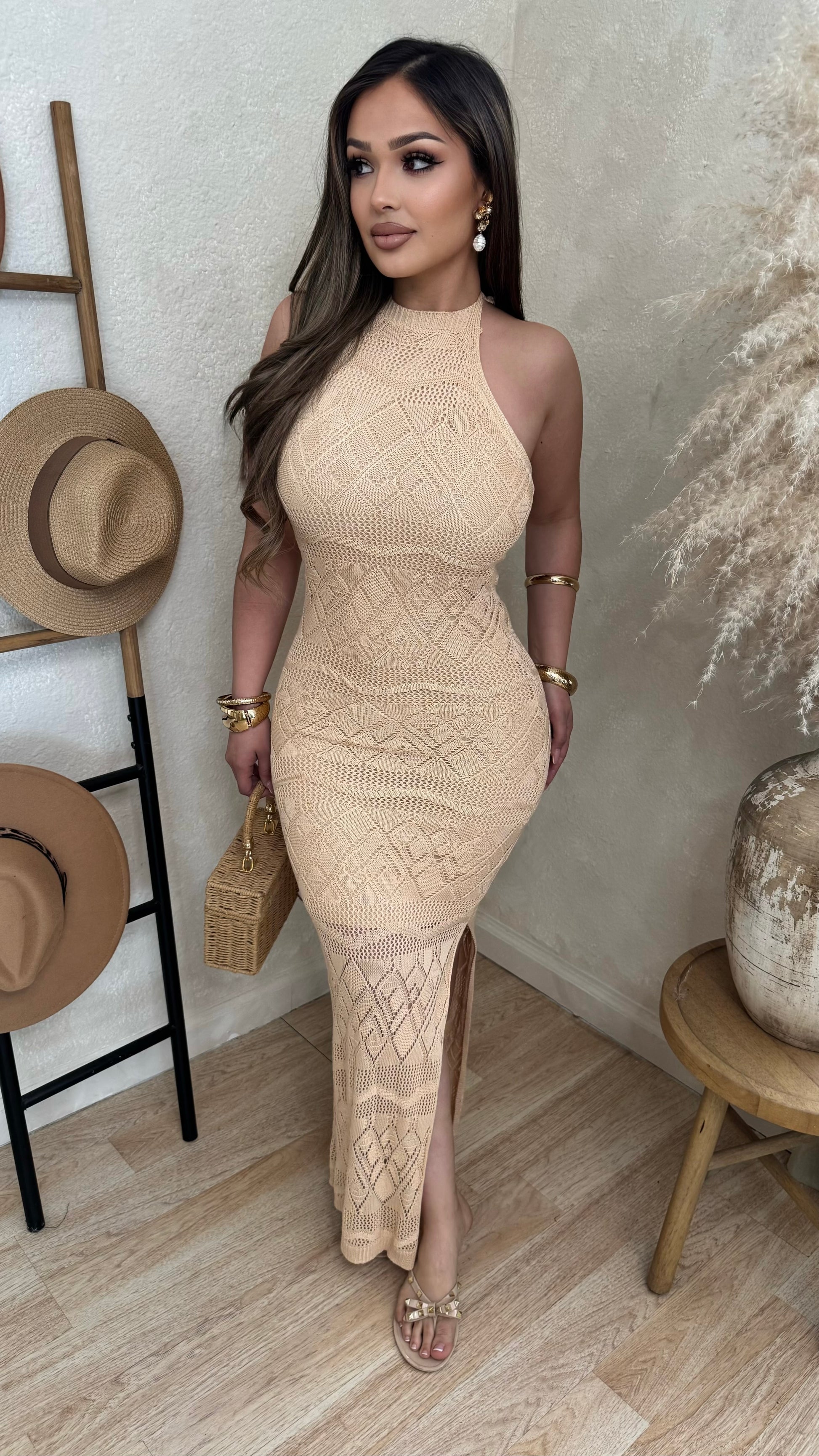 Bring the heat in this intricately knit crochet maxi dress, designed to hug your curves while keeping it breezy and bold. Featuring a high neckline, sleeveless cut, and a subtle side slit for just the right amount of drama, this piece effortlessly blends sultry and sophisticated. Perfect for summer getaways, beach brunches, or sunset dinners.